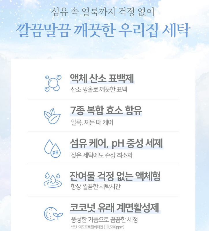소중한 제품을 더욱 깨끗하게 세탁하고자 코코넛 유래 계면활성제(코카미도프로필베타인)가 함유 되었습니다.