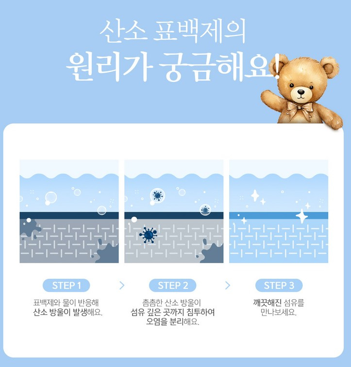 잔여물이 남지 않는 액체형 표백제 입니다. 빠르게 용해되는 액체형 표백제로 잔여물 없이 말끔히 세탁물을 헹궈드립니다.